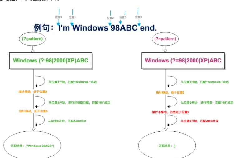 两者的共同点当然都是不会将匹配结果存储起来。区别则是:(?:pattern)匹配到的结果中含有pattern,而(?=pattern)所匹配到的结果中是不含有pattern的。为什么呢?因为(?=)不消耗字符,即在该元素匹配结束后,会继续从预查之前的位置开始继续匹配。 看过这张图你应该明白了何谓不消耗字符串,也明白了(?=)的用法。 -