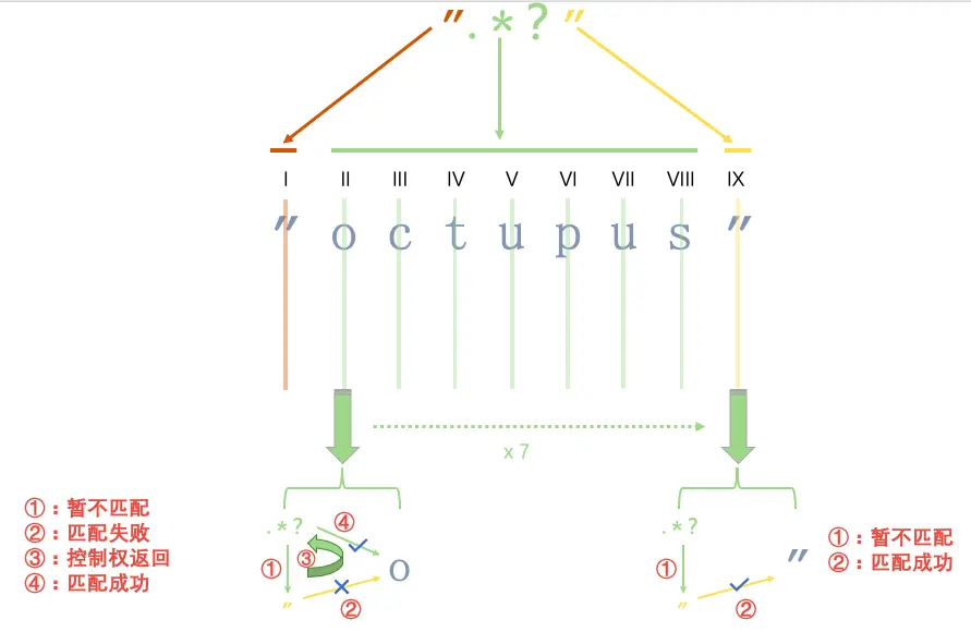 .*?,匹配指针后移到位置II,在字符o处,可以选择匹配或不匹配时的非贪婪模式下,优先选择了不匹配,即忽略子表达式.*?,将控制权交给子表达式"。 - 子表达式