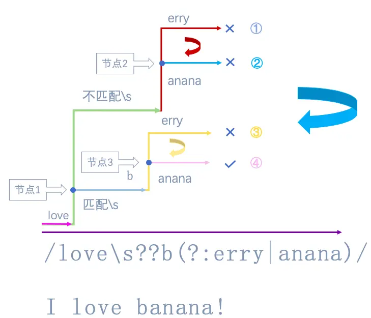 我使用/love\s??b(?:erry|anana)/来匹配"I love banana!",它的流程如图所示。
