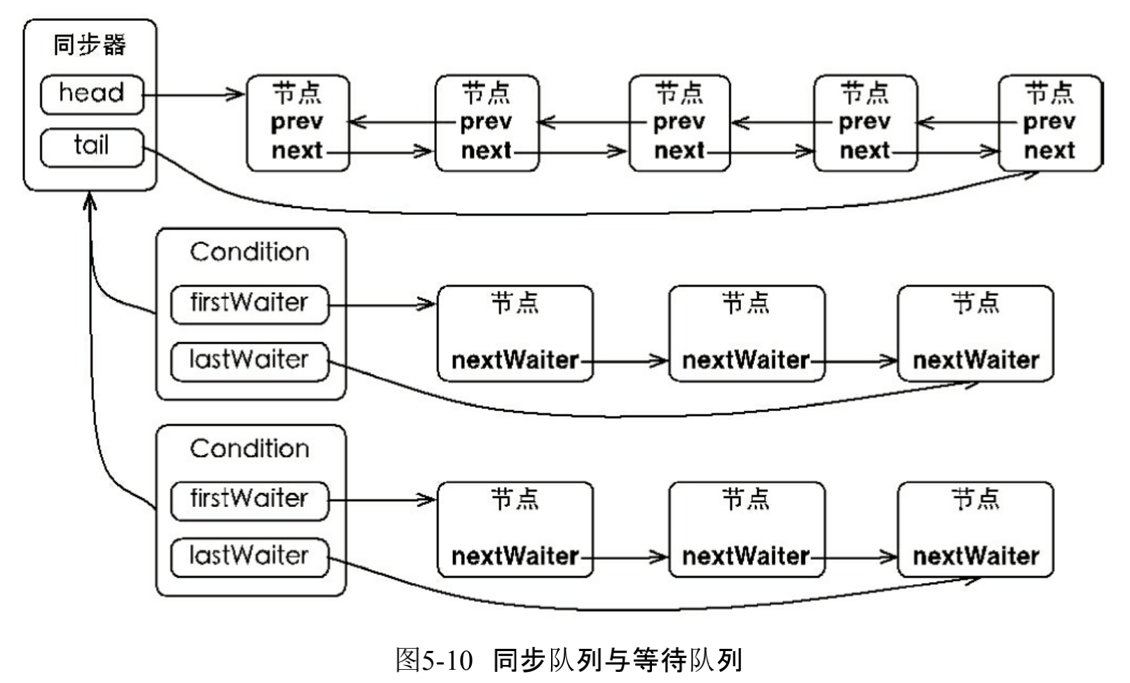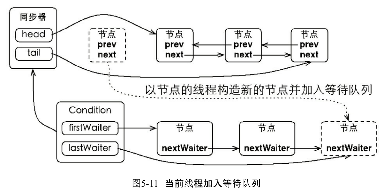 - 如果等待不为空,将该节点设为尾节点,并将之前的尾节点的nextWaiter指向该节点,如图5.11所示