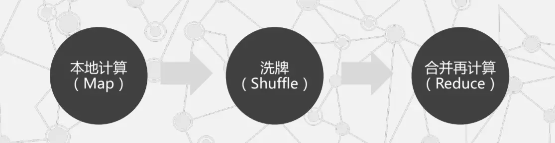 其中,分散总计算就叫 Map,将总计算的中间结果合并再处理就叫 Reduce。中间还有个步骤叫洗牌,洗牌就是 Map 和 Reduce 之间传递中间结果的过程。