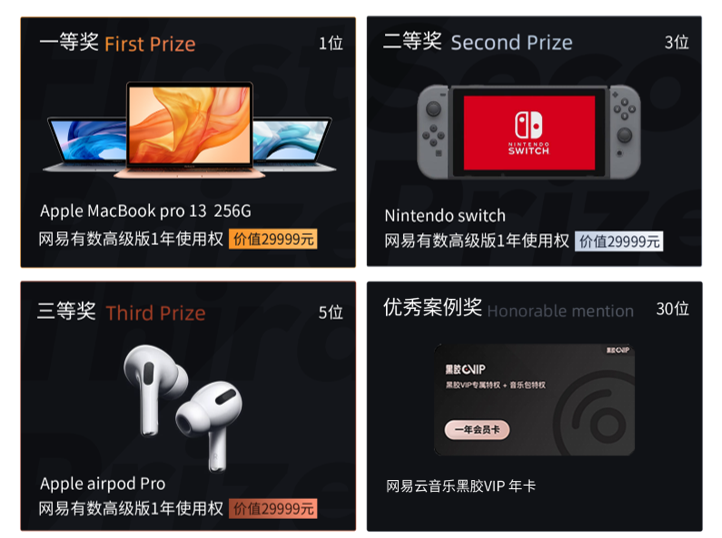 本届网易可视化大赛为参赛高手们准备了Apple Macbook Pro 256G、“网红理财产品” 任天堂Switch、Apple Airpods Pro和网易云音乐黑胶VIP年卡,科技娱乐两不误,助你做这条gai上最会玩的仔~