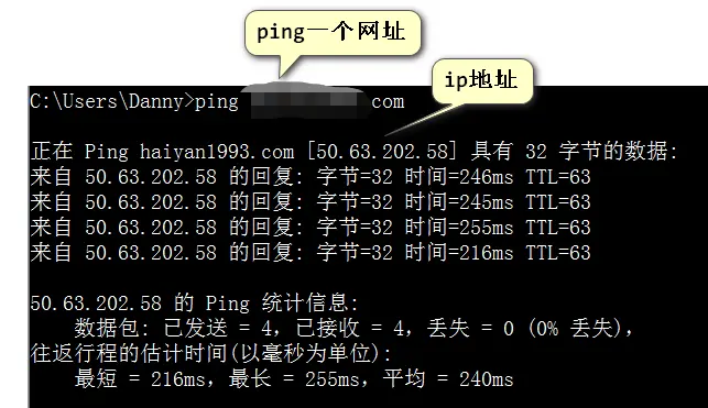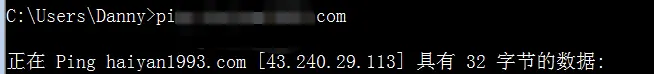 使用ping命令测试域名是不是指向我们的服务器,明显不是: