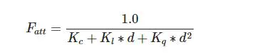 - 常数项通常保持为1.0,它的主要作用是保证分母永远不会比1小,否则的话在某些距离上它反而会增加强度,这肯定不是我们想要的效果。
