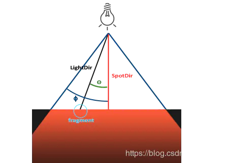 聚光也很常见,例如手电筒,有灯罩的路灯等等,这种光之后朝一个特定方向照射,在光照范围外就没有光照效果。先看下图聚光灯的工作: