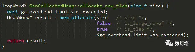 allocate_new_tlab从Java堆上重新为线程分配一块局部缓冲区,实现如下:其中mem_allocate方法实现从Java堆分配临时内存。