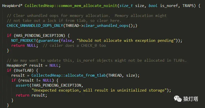 新建一个对象时,由对应的instanceKlass对象计算出需要多大的内存,并调用CollectedHeap的common_mem_allocate_noinit方法分配指定大小的内存,实现如下: