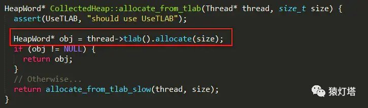 TLAB技术是每个线程在Java堆中预先分配了一小块内存,当有对象创建请求内存分配时,就会在该块内存上进行分配,而不需要在Java堆通过同步控制进行内存分配。如果UseTLAB为真,则使用TLAB技术(Thread-Local Allocation Buffers),将分配工作交由线程自行完成,实现如下: