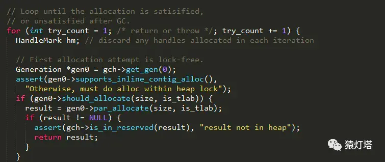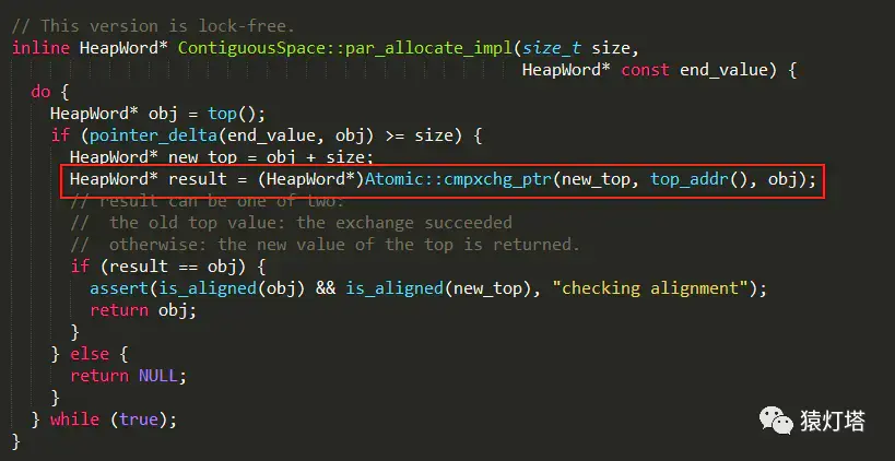 1、首先在新生代采用无锁的方式尝试分配内存,通过Atomic::cmpxchg_ptr的CAS操作对新生代空闲内存进行同步分配,最终实现如下: