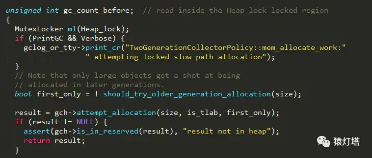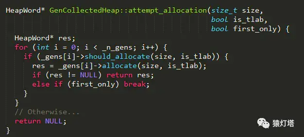 first_only表示当前是否只应该在新生代分配内存,如果新生代的剩余空间不够,则尝试在老年代进行分配;3、依次尝试从内存各个代中分配内存,实现如下: