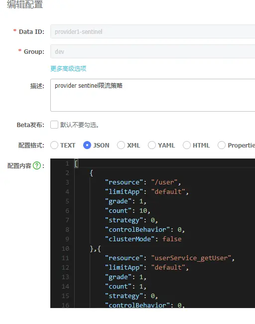 Nacos中创建Sentinel限流规则的配置,以json数组形式保存