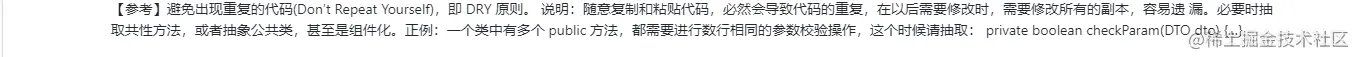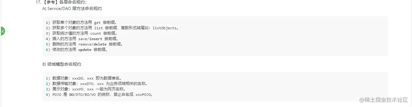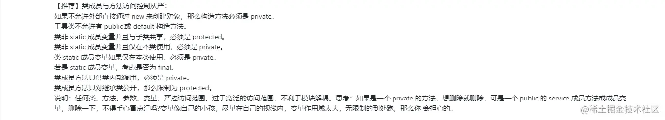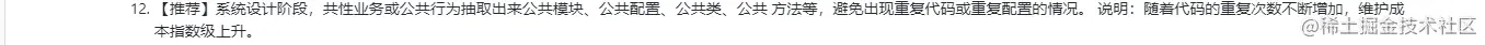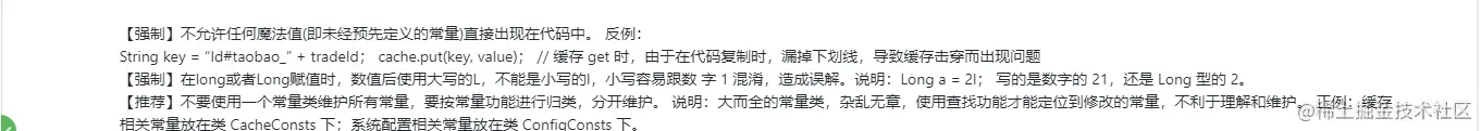 其实东西和网上的阿里开发手册差不多,但是能完全按照执行的肯定特别少,为啥,就比如魔法值,很多时候,为了简单,我们都是直接就在里面定义值了,而不会去说定义一个变量,为啥呢?因为可以少写点代码嘛,久而久之就习惯了,哈哈,但是如果你们公司有代码走读的话,就会好点,因为这样的话你的代码要给所有的项目成员看,所以你不至于把代码写得不规范,就算是有不规范的地方,同事会提出来,那么下次你就会多注意了,我觉得软件开发就是一个产品,既然是一个产品,是一个长期迭代的过程,我觉得一个好的产品不说能像阿里那样活过101年,我们至少能说经过4代人的手,大家还是能很容易看懂你这个项目,这种的产品,在代码方面,我觉得是可以的,至于说产品的用户,那这就看运营和产品的了。下面我就截取一部分,注意的点分享给大家。