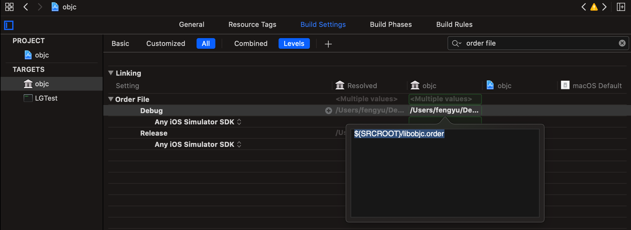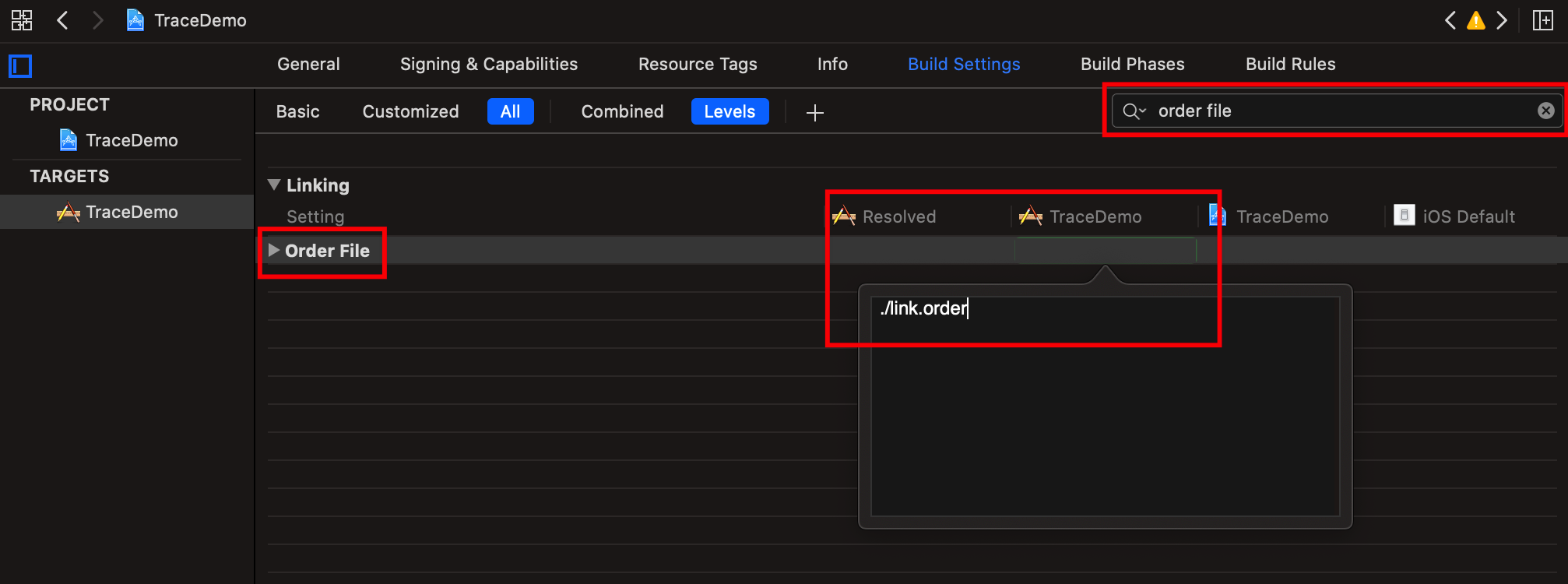 Target -> Build Setting -> Linking -> Order File 设置 order file 的路径