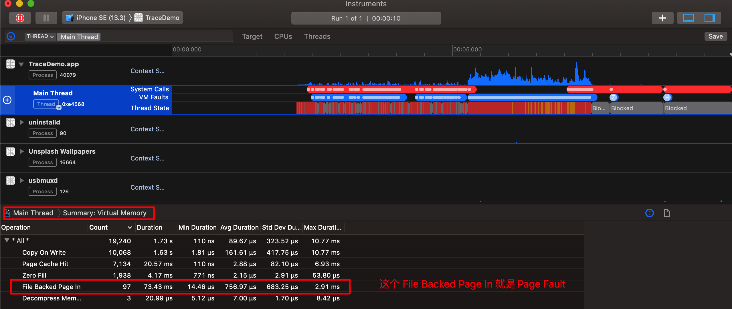 我们可以看到图中项目的Page Fault 数量并不多,这是因为当前项目是一个demo,代码和文件都极少。当代码多起来的话,Page Fault的 数量和加载耗时都会随着代码增加而增加。