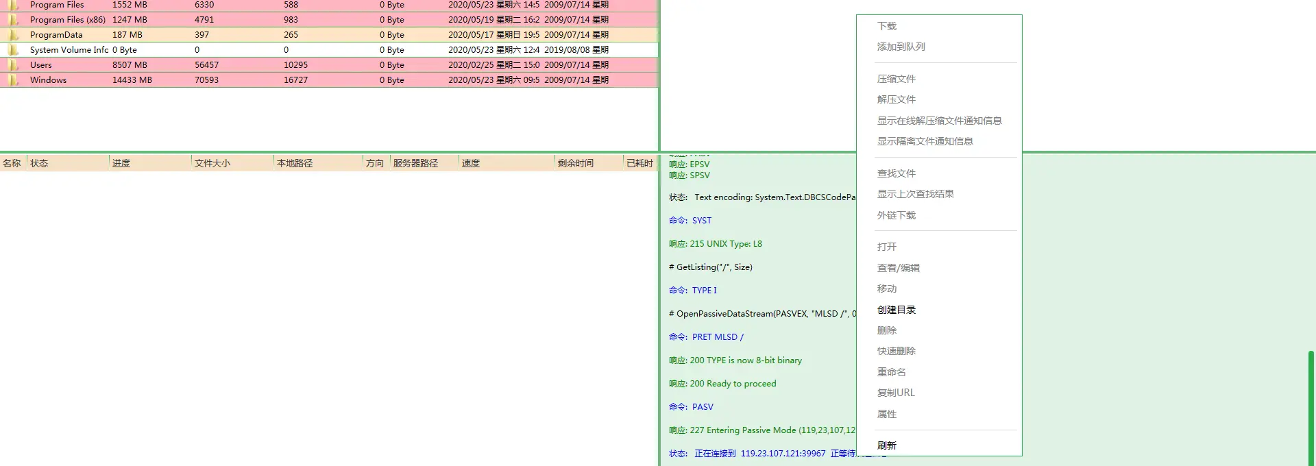 - 在面板中就可以实现计算机与远程主机的文件上传工作了。