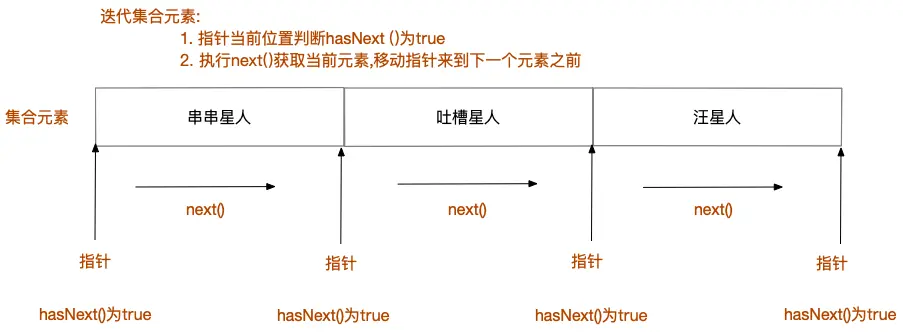 调用Iterator的next方法之前迭代器的索引位于第一个元素之前,不指向任何元素,当第一次调用迭代器的next方法后,迭代器的索引会向后移动一位,指向第一个元素并将该元素返回,当再次调用next方法时,迭代器的索引会指向第二个元素并将该元素返回,依此类推,直到hasNext方法返回false,表示到达了集合的末尾,终止对元素的遍历