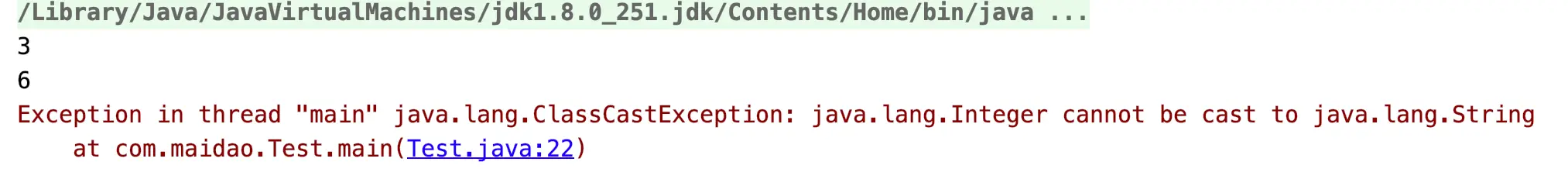 把对象存储集合后,那么这时他们都会被提升成Object类型。当我们在取出每一个对象,并且进行相应的操作,这时必须采用类型转换public class Test { public static void main(String[] args) { Collection coll = new ArrayList(); coll.add("abc"); coll.add("itcast"); coll.add(5);//由于集合没有做任何限定,任何类型都可以给其中存放 Iterator it = coll.iterator(); while(it.hasNext()){ //需要打印每个字符串的长度,就要把迭代出来的对象转成String类型 String str = (String) it.next(); System.out.println(str.length()); } } }程序在运行时发生了问题