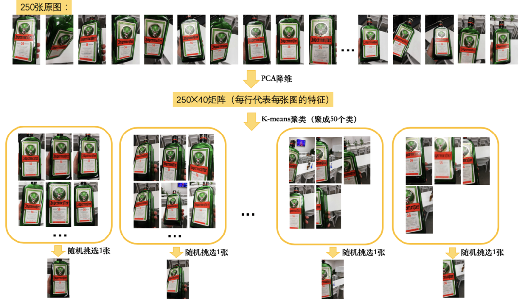 在对训练集进行分析后,我们发现由于数据采集方式较为单一,导致训练集中同一类别下的图像重复度较高,如果直接训练将花费较长时间,且容易带来模型过拟合的问题。因此我们采用K-means聚类方法对训练集进行聚类,在每个类中随机抽取一张作为此类的代表,训练过程如下图所示。最终训练集中,每个类别下的样本数据减少为原来的1/5,聚类后的数据集仅保留了差异较为明显的样本。