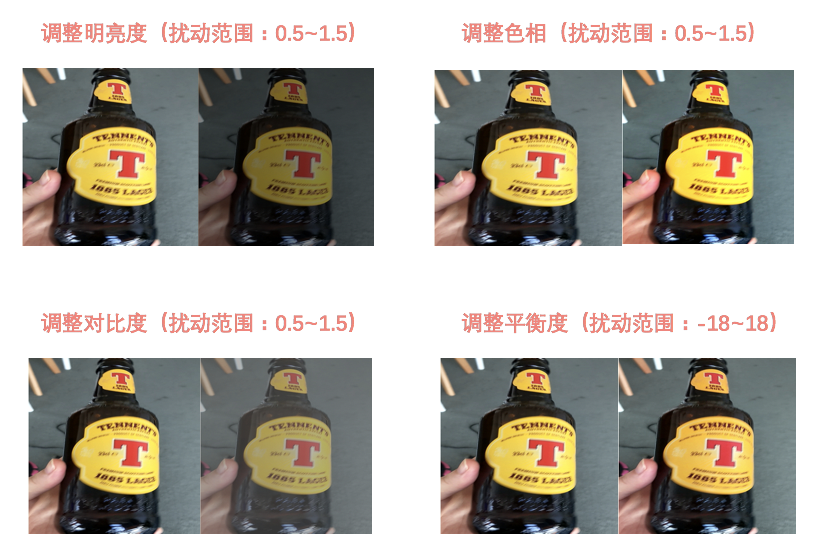 在真实应用场景中,被拍摄的酒瓶往往会受到光线、摆放角度、入镜大小等因素的影响,会与训练集存在一定的差异,通过数据增强来提高模型的泛化能力,是十分必要的。数据增强主要为5个步骤,具体如下: