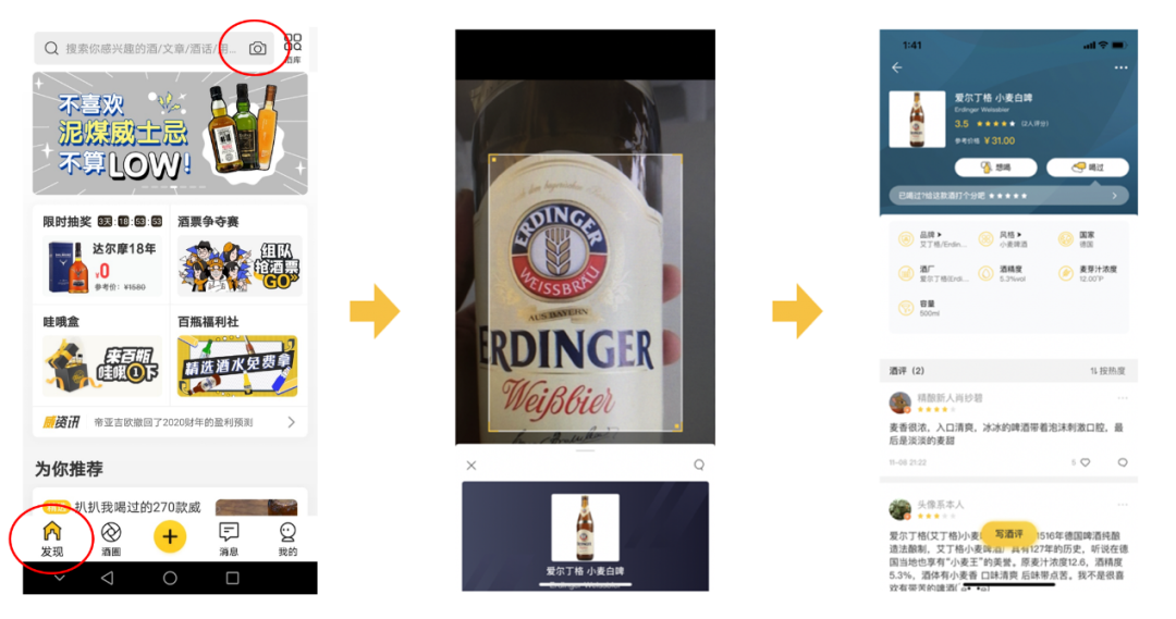 训练后的模型成功部署于“百瓶App”,支持了App中的“扫酒标识酒”功能。如图4所示,打开App中的拍照功能,拍摄想识别的酒标,即可快速识别出对应的酒,并把酒的相关信息和评论信息推送出来。