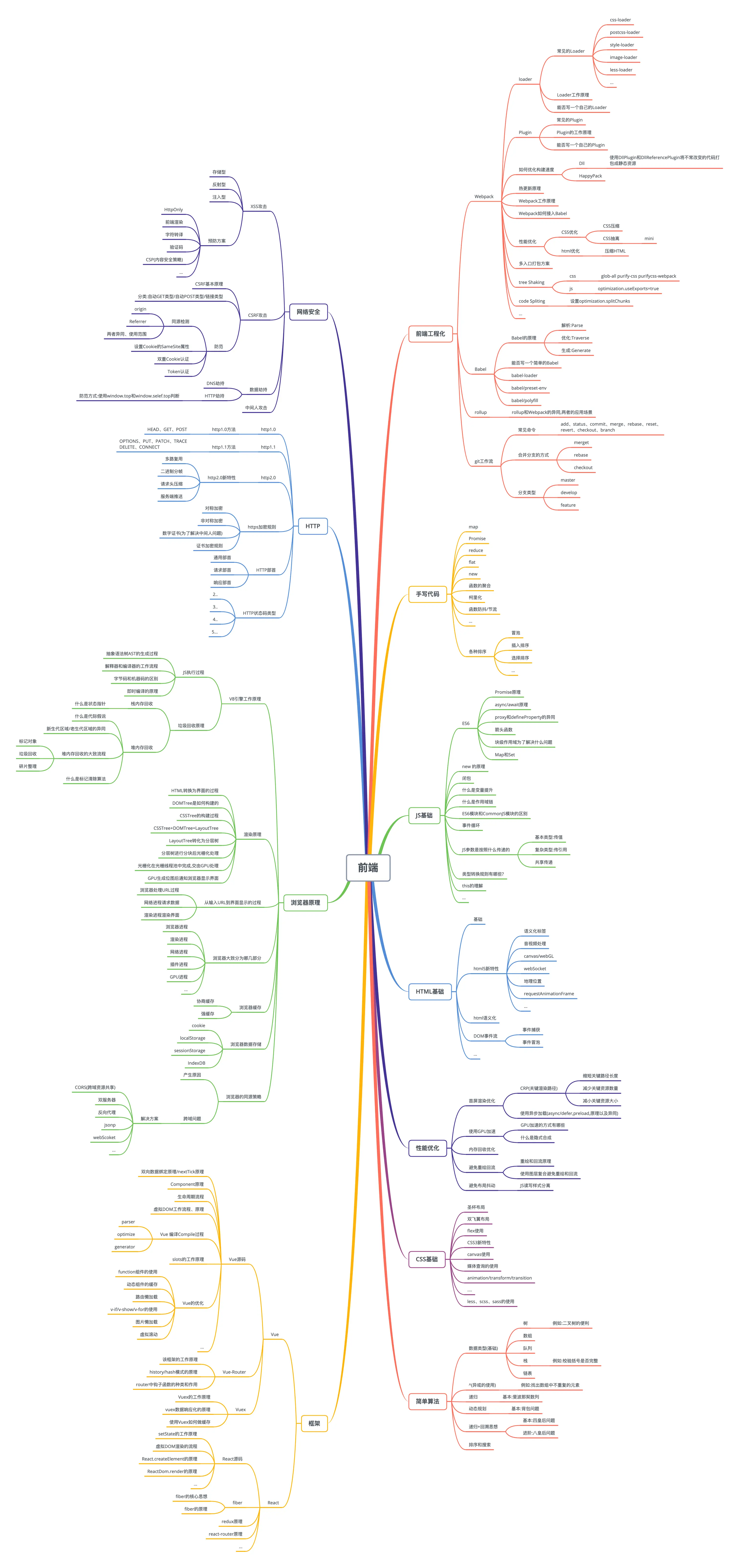 前端初中级面试知识框架整理 桔子汽水 2020-05-25 219 阅读1分钟 前言 基于十来天的面试经历,大概整理了一份初中级前端的知识框架梳理,当作一个知识的整理吧.也希望可以帮到其他的同学.整理的不是很全面,如果有兴趣的同学可以互相探讨一下.后续会持续更新相关知识点的整理,欢迎大家一起讨论进步💪 因为知识点涉及的比较多,所以分篇分批次整理到下面: 手写JS源码 浏览器原理