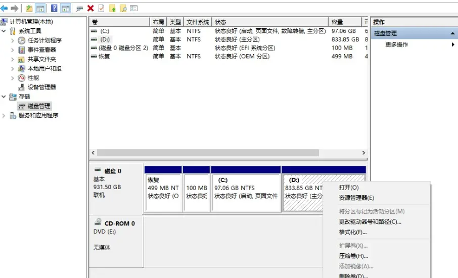 将这个空闲分区还原,我当初是从 D 盘压缩出的这 600GB 空间,选中 D 盘右击 扩展卷,恢复如初。