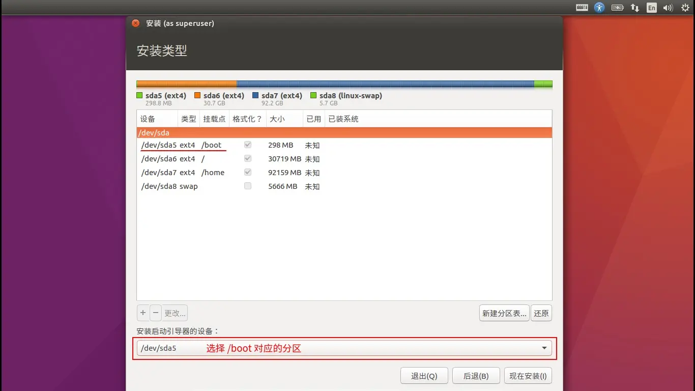 安装启动引导器的设备 选择 /boot 对应的分区。确认无误后点击安装。