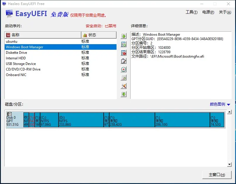 如果使用 easyUEFI 软件查看 EFI 启动项,发现 Ubuntu 把自己的 efi 引导文件写到 Windows 的 efi 引导分区。