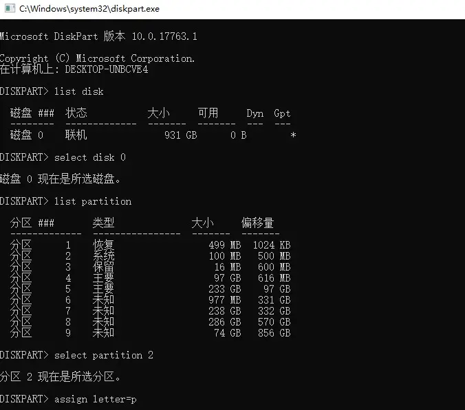 (1)右键点击Windows图标,选择命令提示符(管理员) (2)输入diskpart 回车 (3)输入 list disk //列出系统中拥有的磁盘 (4)select disk 0 //选择EFI引导分区所在的磁盘,请根据实际情况选择 (5)list partition //列出所选磁盘拥有的分区 (6)select partition 1 //选择EFI引导分区,类型为系统的分区,就是EFI引导分区 (7)assign letter=p //为所选分区分配盘符,请分配空闲盘符