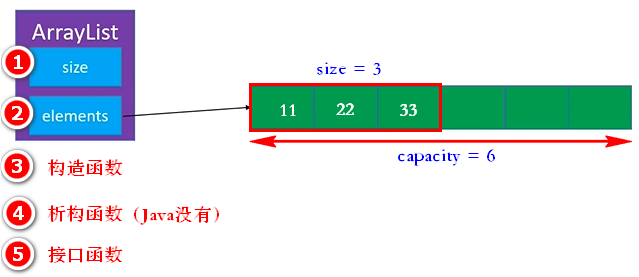 size = 元素(Element)数目 = 数组长度 ≤ 数组容量(capacity)。