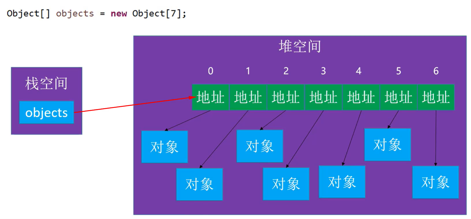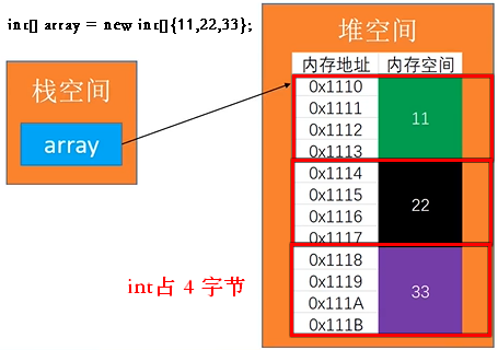 该代码在内存中表现为:局部变量array存在栈中,new出来的数组元素顺序存储在堆中。 如下图所示: