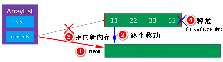 缩容与扩容的操作类似。两者都是:①先开辟一块新的内存空间;②然后再将之前的数组元素逐一移到新的内存;③让用来存放数组的成员elements指向新的内存空间;④将之前的数组内存释放(Java垃圾自动回收)。只不过,扩容新开辟的内存空间更大,缩容新开辟的内存空间更小。