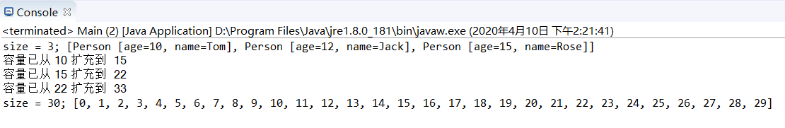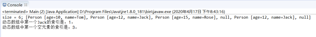 System.out.println("动态数组中第一个Jack的索引是:" + persons.indexOf(person) + " 。");