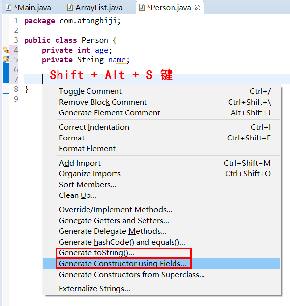 先新建一个名称为ArrayList(包名为:com.atangbiji)的类,用来自己实现动态数组;