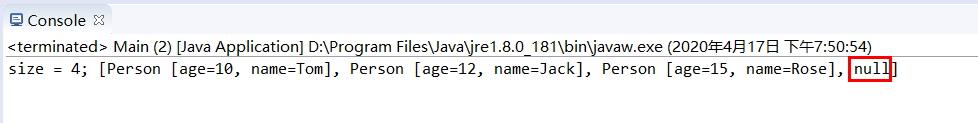 System.out.println("动态数组中第一个空元素的索引是:" + persons.indexOf(null) + " 。");