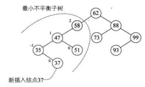 距离插入结点最近的, 且平衡因子的绝对值大于1的根结为根的子树, 我们称之为最小不平衡树.