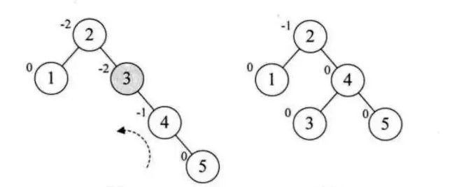 - 继续添加4 5, 当插入5会导致失衡, 此时最小失衡是在3这个结点, 此时对3进行左旋转得到一个平衡的二叉树