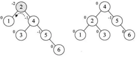- 添加6, 导致失衡, 此时最小失衡是在2这个结点,此时对2进行左旋转得到一个平衡的二叉树