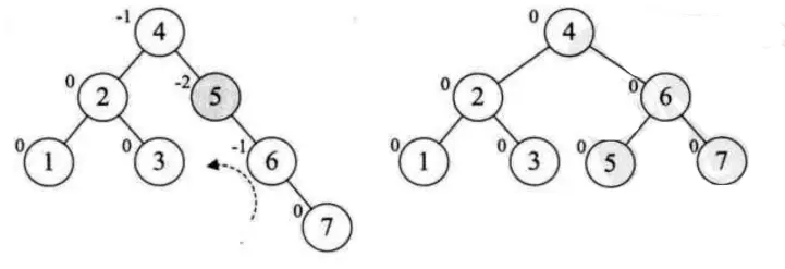 - 添加7, 导致失衡, 此时最小失衡是在5这个结点,此时对5进行左旋转得到一个平衡的二叉树