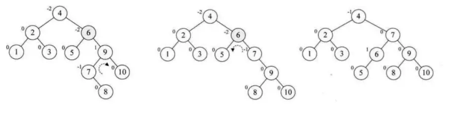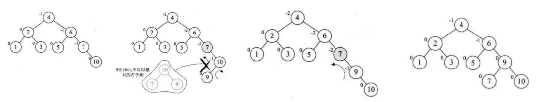 - 添加10 9, 当插入9会导致失衡, 此时最小失衡是在7这个结点, 但是此时7的值为-2 10为1, 两个是互异的, 所以直接旋转会出错, 这个时候就需要将10这个结点进行右旋, 再对7结点进行左旋得到平衡的二叉树