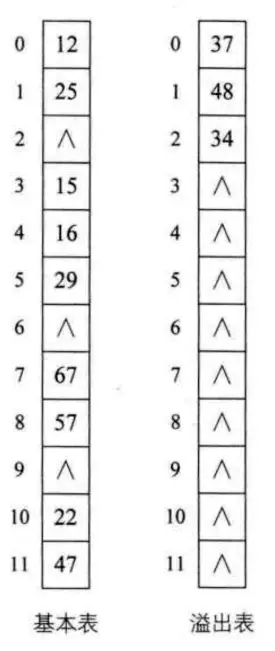 凡是冲突的数据, 都将这个冲突的数据存储起来, 建立一个公共的溢出区来存放. 先去基本表查找, 冲突后再去溢出表顺序查找.