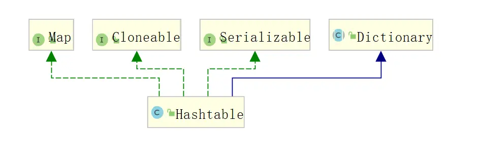Hashtable继承自Dictionary,实现了Map、Cloneable、Serializable接口。、