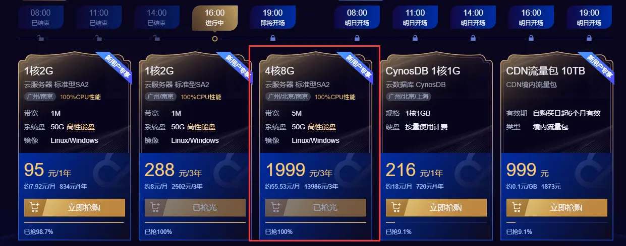 这几天的秒杀抢购实在有点火爆!特别是4核8G 5M带宽的这款,手慢点还买不到。