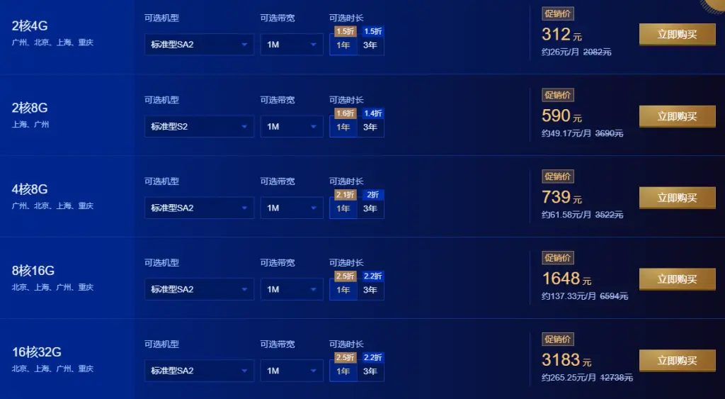看了下,主要有两种服务器类型选择,一个是标准型SA2一个是标准型S2,其中SA2的性价比要更高些。