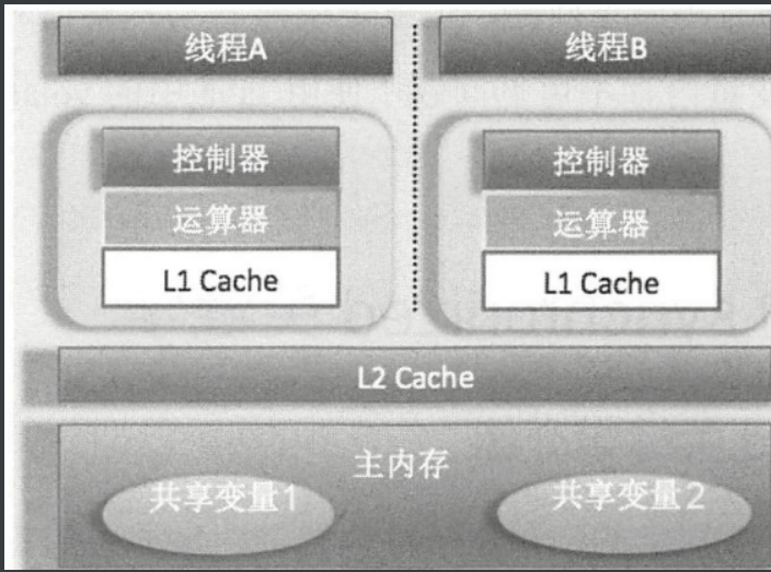 图中是个双核 CPU 系统架构,每个核都有自己的 1 级缓存 (L1) ,还有个所有CPU共享的二级缓存 (L2),Java 中的工作内存就对应着 1 级缓存加上一些硬件。