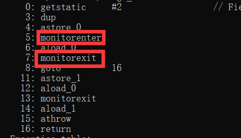 javap -verbose指令(详情请百度) 反汇编后可以看到 synchronized在jvm中的实现机制是 monitorenter 和 monitorexit,至于为什么有两个monitorexit出现,因为一个与异常处理相关,只有一个 monitorexit 会被执行。