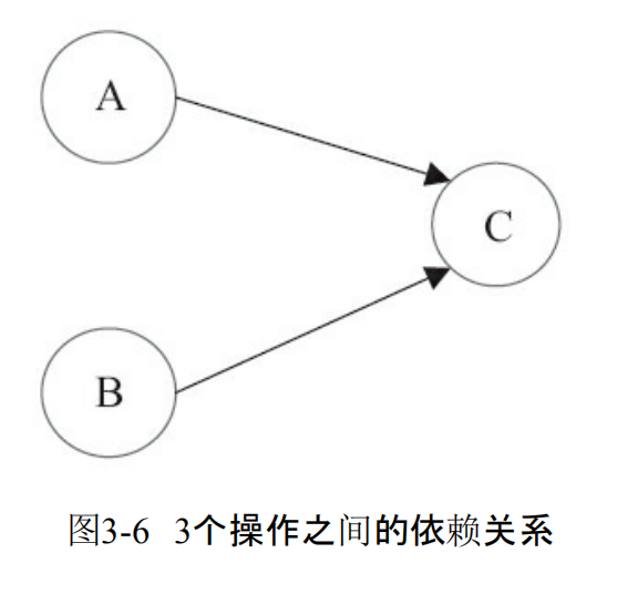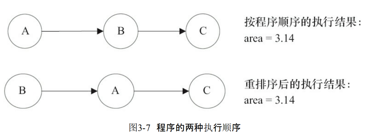 A 和 C 之间存在数据依赖关系, B 和 C 之间也存在数据依赖关系。因此在最终执行的指令序列中,C 不能被重排序到 A 和 B 的前面,A 和 B 没有数据依赖关系,编译器和执行器可以对他们进行重排序