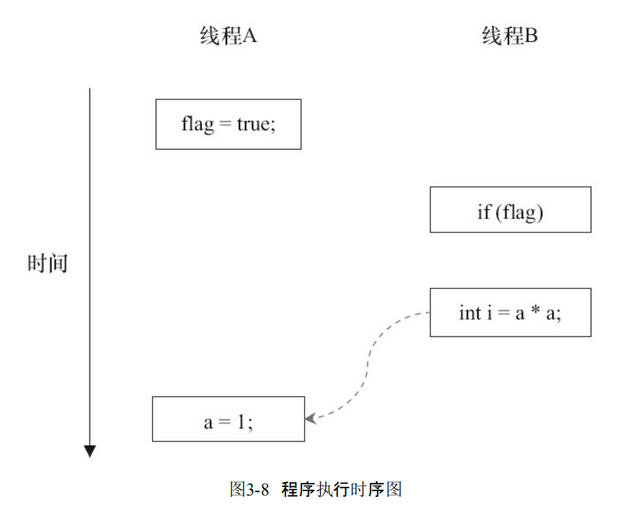 上图中操作 1,2 进行了重排序,程序执行时,线程 A 首先写标记变量 flag ,随后线程 B 读这个变量。由于条件判断为真,线程 B 将读取变量 a 。此时变量 a 还没有被线程 A 写入,在这里多线程程序的语义被重排序破坏了。