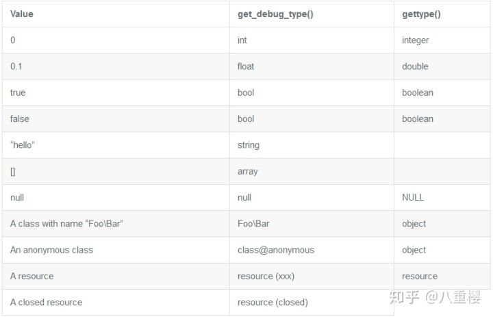 可以在 RFC 中找到 get_debug_type() 和 gettype() 之间的差异的完整列表。