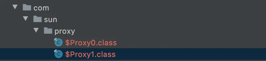 然后运行上面的main函数,最后我们在工程根目录下面,会看到一个 com的文件夹,逐层打开后,会发现一些名为 $Proxy*.class 文件: